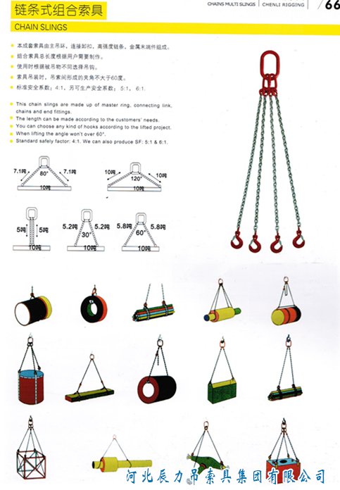 圖為辰力公司產品介紹冊中的一頁。正如圖中展示,辰力生產多種吊索具類產品,起重鏈條、***環(子母環)、環眼鉤等。圖中還為大家展示了鏈條式組合索具的集中吊裝方式,希望能夠幫到您。聯系電話:0312-8037111